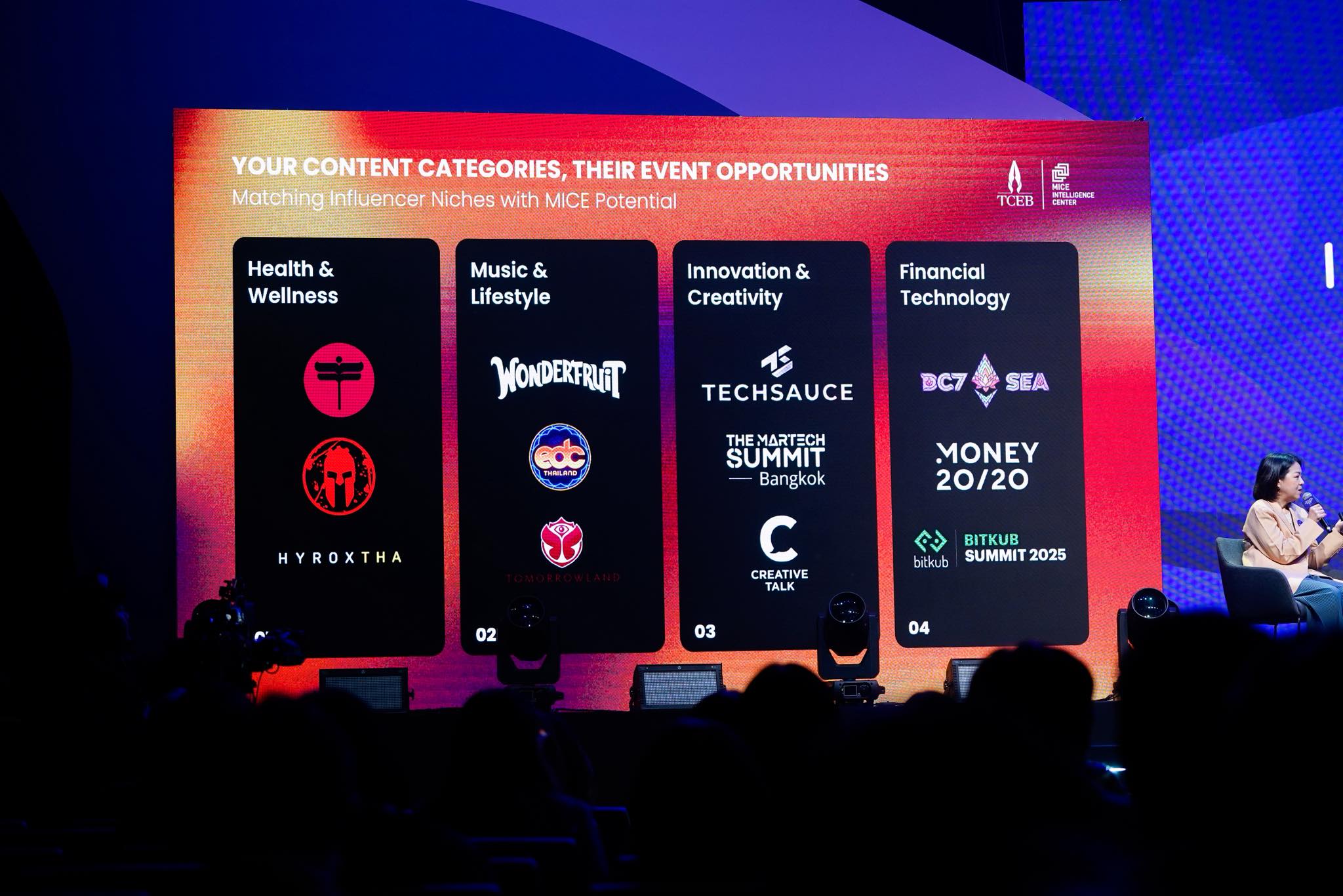 นอกจากนี้ ภายในงานยังมีเวทีแลกเปลี่ยนมุมมองความคิดและองค์ความรู้จากหน่วยงานต่าง ๆ ทั้งภาครัฐและเอกชน รวมถึงเหล่าครีเอเตอร์หลากหลายสาขาไม่ว่าจะเป็นท่องเที่ยว การเงิน ประกันภัย ซอฟต์พาวเวอร์ และข้อมูลจากงานวิจัย “Futures of Content Creators in Thailand 2035” หรือ อนาคตอุตสาหกรรมคอนเทนต์ครีเอเตอร์ในไทย พ.ศ. 2578 ซึ่งจัดทำโดย บริษัท เทลสกอร์ จำกัด (Tellscore) ร่วมกับศูนย์วิจัยอนาคตศึกษาฟิวเจอร์เทลส์ แล็บ (FutureTales LAB) และสถาบันวิชาการเพื่อความยั่งยืนทางสุขภาพจิต (TIMS) ฉายภาพสถานการณ์อุตสาหกรรม Content Creators / Influencers ในปัจจุบัน และเจาะลึกแนวโน้มสำคัญของวงการในอีก 10 ปีข้างหน้าอีกด้วย