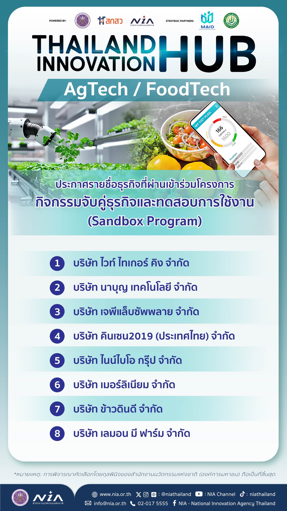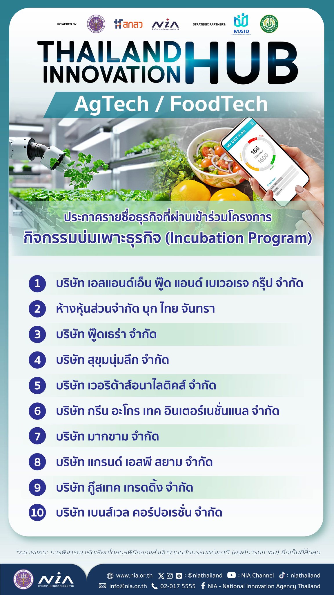 #NIA #MJU #MAiD #AgTech #FoodTech #AgriFood #ThailandInnovationHub #IncubationProgram #SandboxProgram #บ่มเพาะธุรกิจนวัตกรรม #จับคู่ธุรกิจและทดสอบการใช้งาน #นวัตกรรมเกษตรและอาหาร