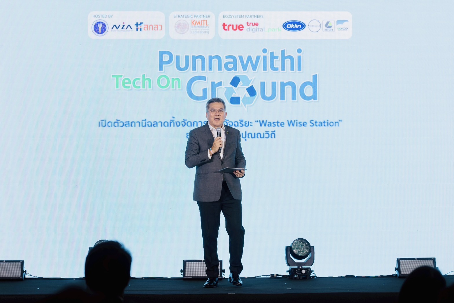 ดร.กริชผกา บุญเฟื่อง ผู้อำนวยการสำนักงานนวัตกรรมแห่งชาติ กล่าวว่า หนึ่งในโจทย์ท้าทายสำคัญที่ต้องเร่งแก้ไขคือ ‘การจัดการขยะภายในเมือง’ ซึ่งกรุงเทพมหานครเป็นแหล่งกำเนิดขยะมากที่สุดในประเทศ NIA จึงร่วมกับเครือข่ายพันธมิตร Punnawithi Tech On Ground สถาบันเทคโนโลยีพระจอมเกล้าเจ้าคุณทหารลาดกระบัง กลุ่มบริษัท ทรู คอร์ปอเรชั่น จำกัด (มหาชน) และศูนย์การทดลองเมืองกรุงเทพฯ (Bangkok City Lab) ออกแบบ ‘ฉลาดทิ้ง: สถานีจัดการขยะอัจฉริยะ’ ในพื้นที่ของทรู ดิจิทัล พาร์ค ซึ่งเป็นศูนย์กลางย่านนวัตกรรมปุณณวิถี เพื่อเป็นพื้นที่ต้นแบบการทดลองใช้ 5 นวัตกรรมตู้รับขยะอัจฉริยะ สำหรับขยะ 5 ประเภท ได้แก่ ขยะประเภท E-Waste ขยะประเภทเศษอาหารหรือย่อยอาหารเป็นปุ๋ย ขยะประเภทเสื้อผ้า ขยะประเภทขวดพลาสติก และขยะประเภทน้ำมันเก่า เพื่อช่วยบริหารจัดการขยะภายในเมือง เพิ่มพื้นที่คัดแยกขยะอันเป็นโครงสร้างพื้นฐานเมืองให้กับประชาชน และเพิ่มโอกาสในการพัฒนาธุรกิจในรูปแบบต่าง ๆ รวมถึงโอกาสการขยายธุรกิจให้กับผู้ประกอบการไทย เพราะ Punnawithi Tech On Ground ไม่เพียงเป็นเวทีแสดงนวัตกรรม แต่ยังเปิดโอกาสให้ภาคธุรกิจ นักลงทุน และผู้ประกอบการที่สนใจลงทุนในธุรกิจ ESG & Circular Economy ได้พบปะและสร้างเครือข่ายความร่วมมือ เพื่อขยายตลาดและหาพันธมิตรทางธุรกิจ ซึ่งจะช่วยผลักดันการเปลี่ยนผ่านสู่เศรษฐกิจหมุนเวียนในระดับประเทศต่อไป”