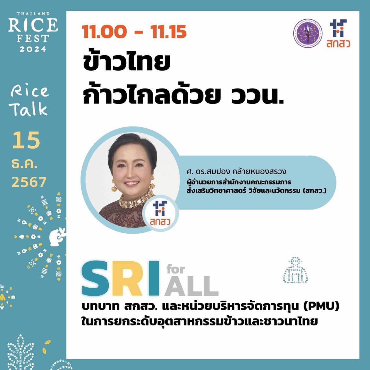 ⏰ เวลา 11.00 - 11.15 น. บรรยายพิเศษภายใต้หัวข้อ “ข้าวไทยก้าวไกลด้วย ววน.”