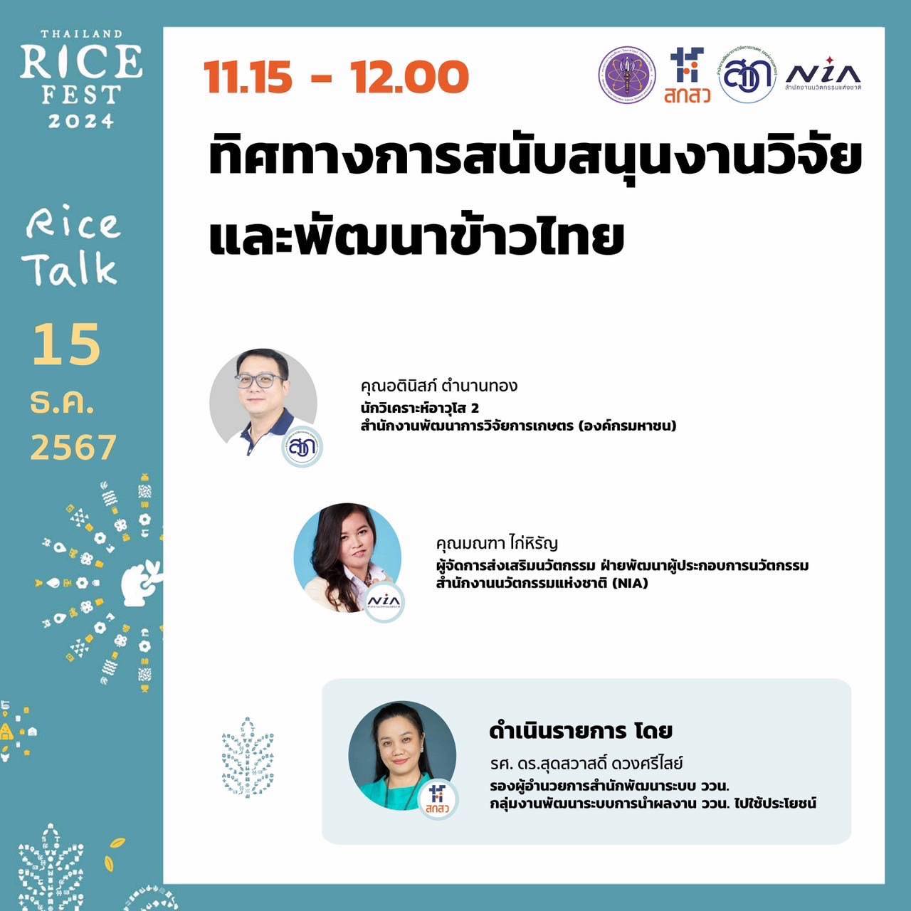 ⏰ เวลา 11.15 – 12.00 น. การเสวนาภายใต้หัวข้อ “ทิศทางการสนับสนุนงานวิจัยและพัฒนาข้าวไทย” โดย