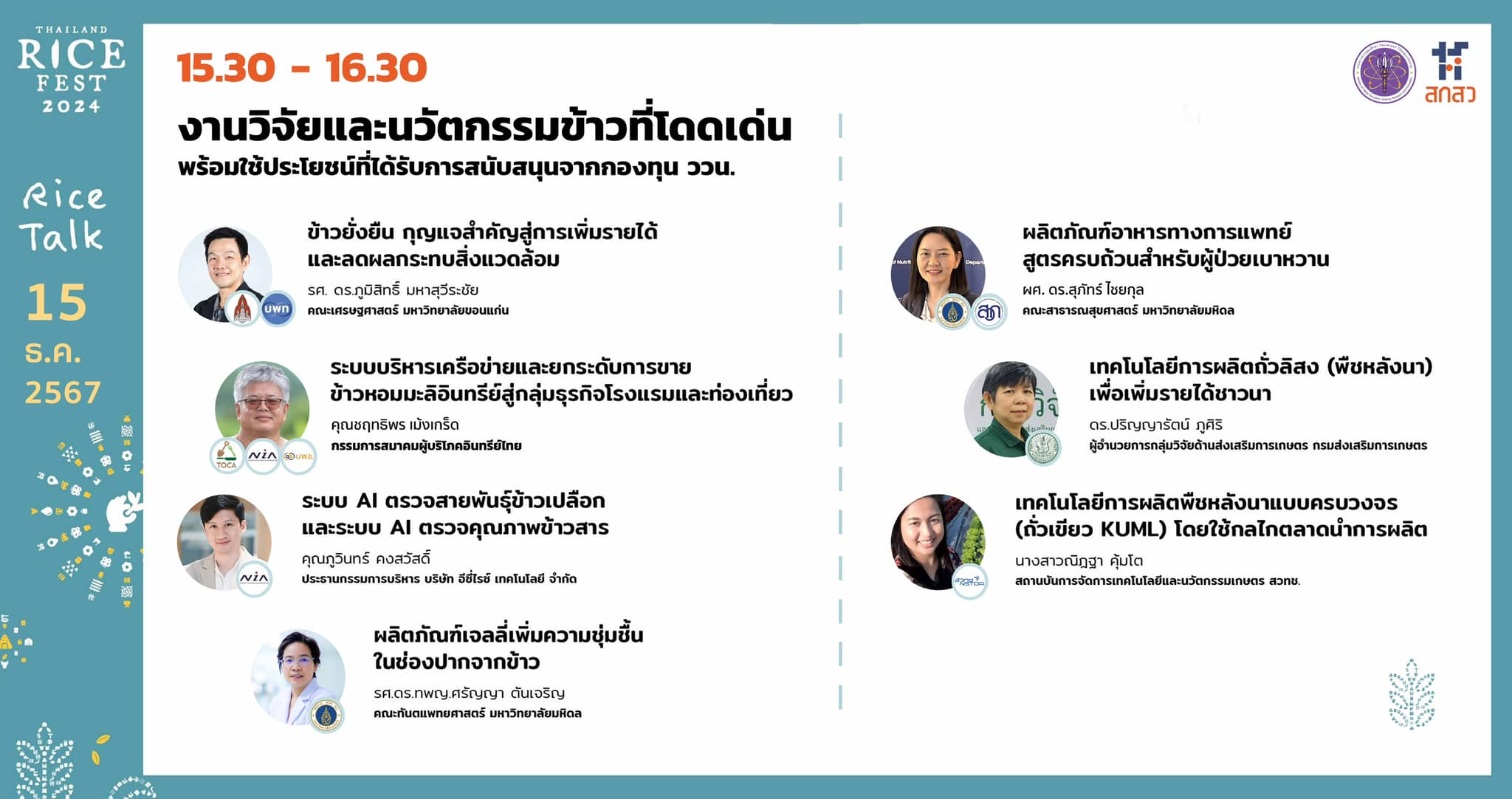 ⏰ เวลา 15.30 - 16.30 น. การนำเสนองานวิจัยและนวัตกรรมข้าวที่โดดเด่น พร้อมใช้ประโยชน์ ที่ได้รับการสนับสนุนจากกองทุน ววน. จำนวน 7 ผลงาน